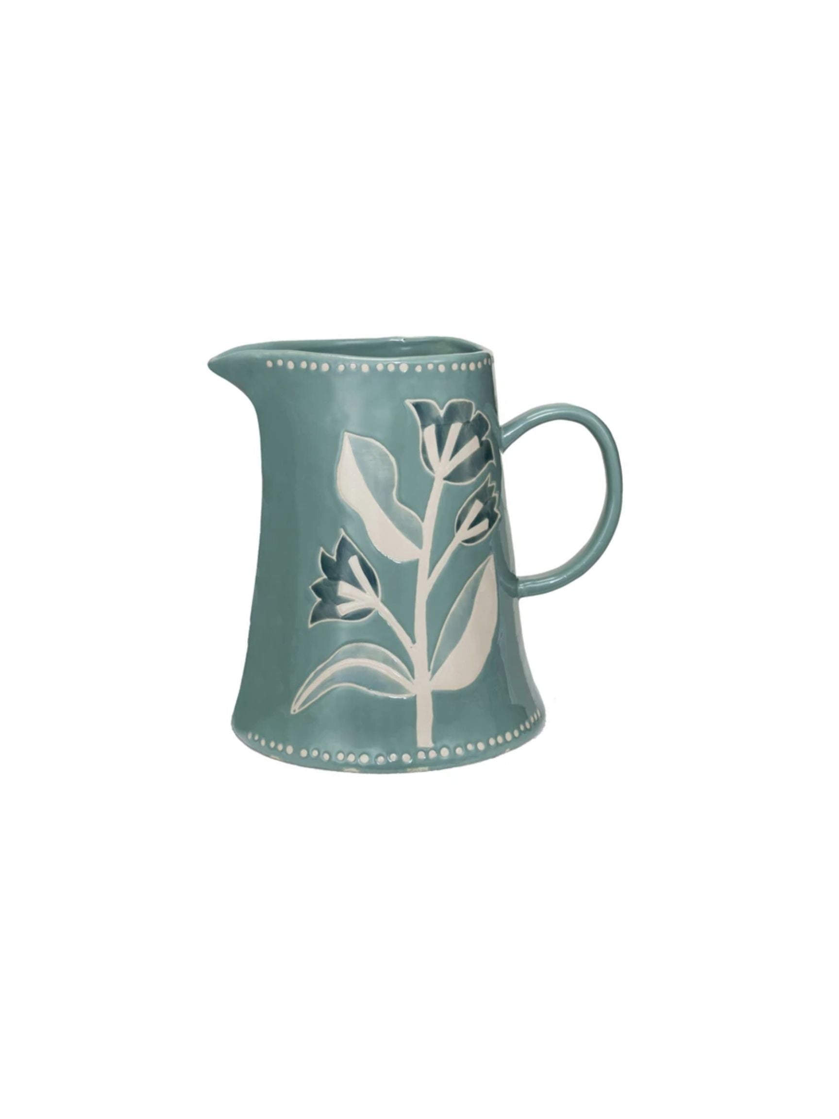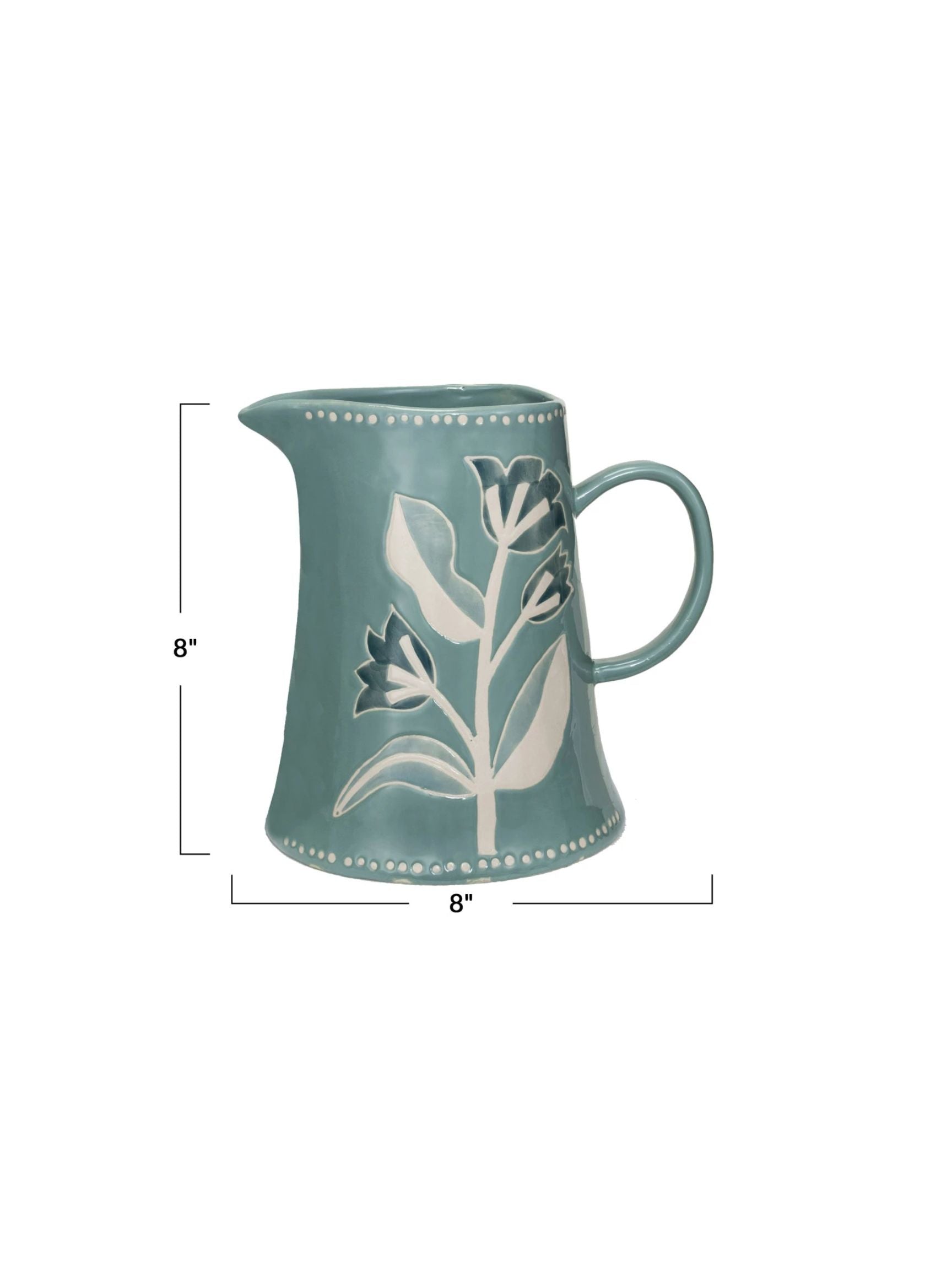 2 Quart Hand-Painted Stoneware Pitcher w/ Wax Relief Flowers -Pick Up Only