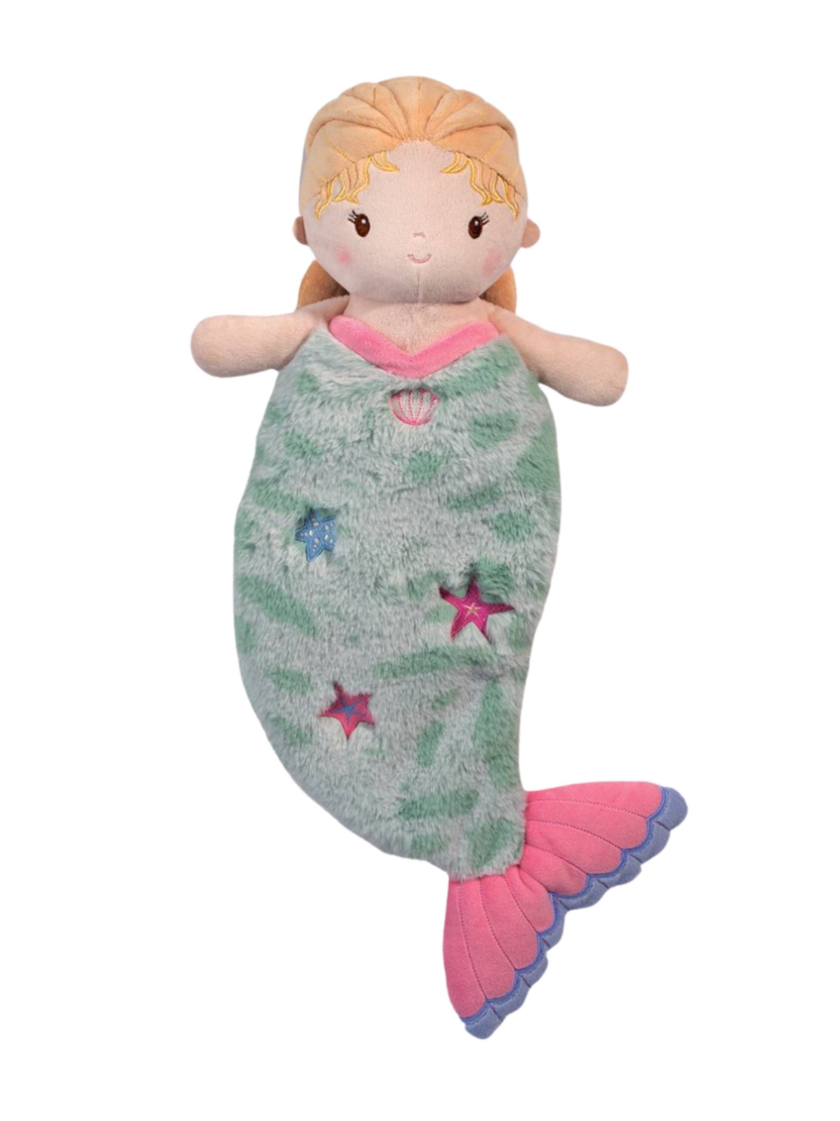 Cora the Mermaid Sshlumpie is the perfect way to introduce your baby to the magic of the ocean! Her cheery expression, green and pink tail and starfish pattern will make her a new favorite friend for your baby or a beloved gift for new parents. Only lightly stuffed, our Sslumpies are both a doll and a blank friend all at once! Sshlumpies are easy for Baby to carry and convenient for parents to pack into the diaper bag or stroller. They’re also machine washable, and the fabric and embroidered features are baby-safe.
