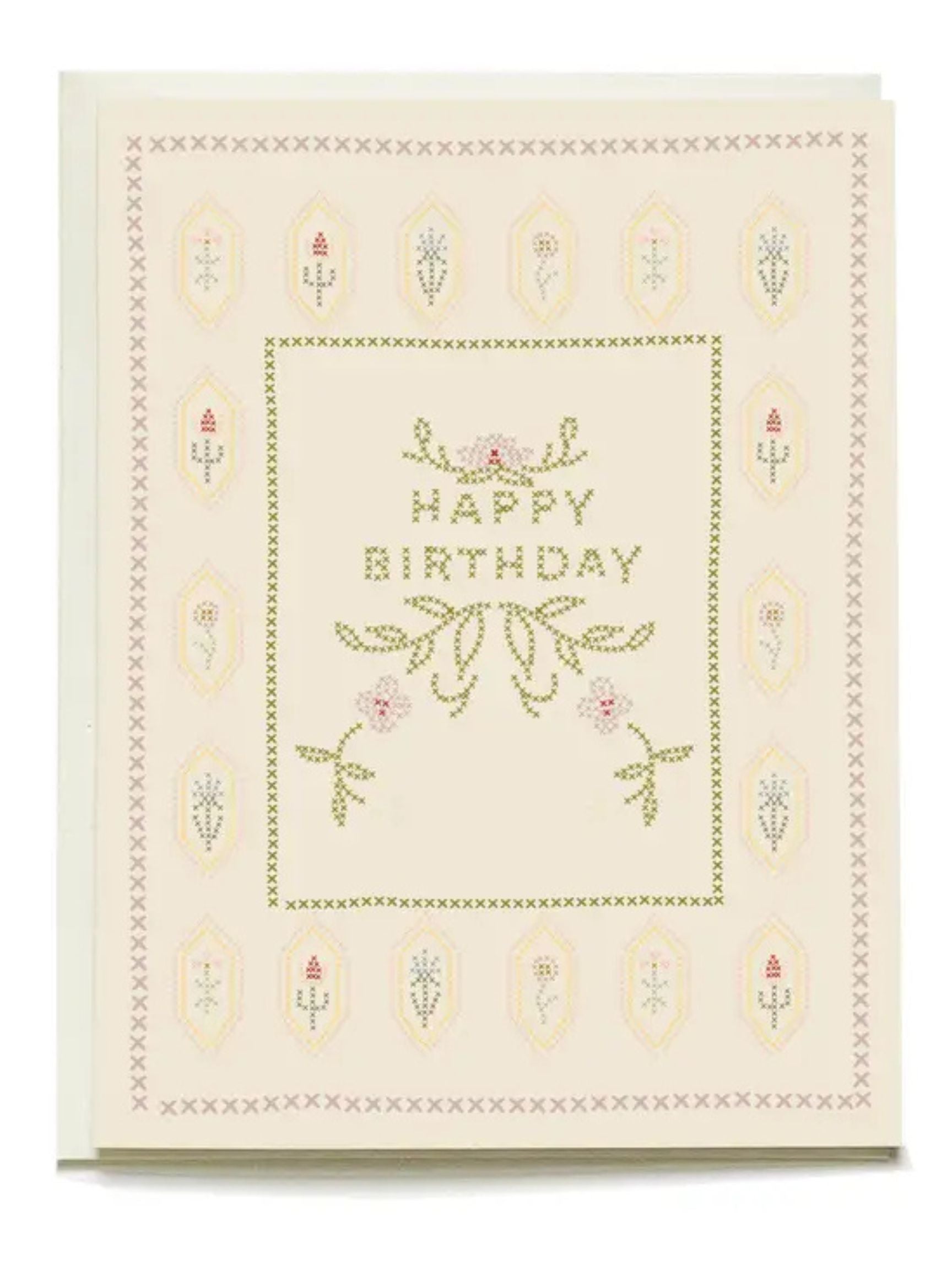 Cross-Stitch Birthday Greeting Card - handmade, pattern, floral, grandma