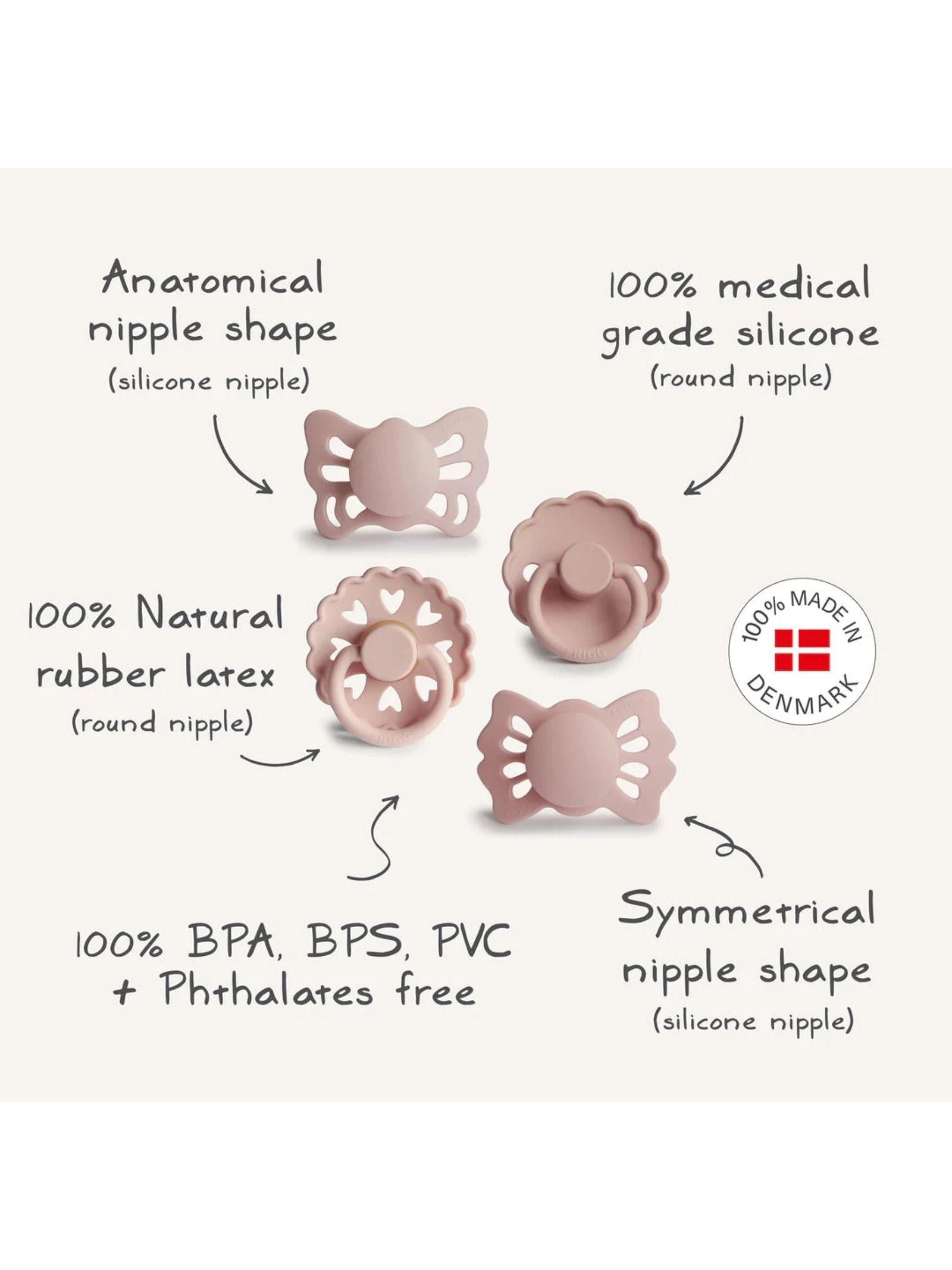 The FRIGG Baby’s First Pacifier set features 4 popular FRIGG styles with different nipple materials and shapes so parents can easily try out various options to find out which works best for their baby's unique needs.