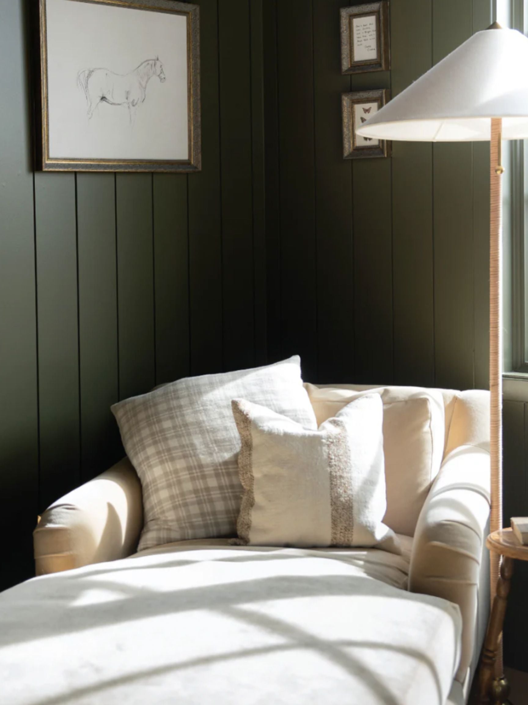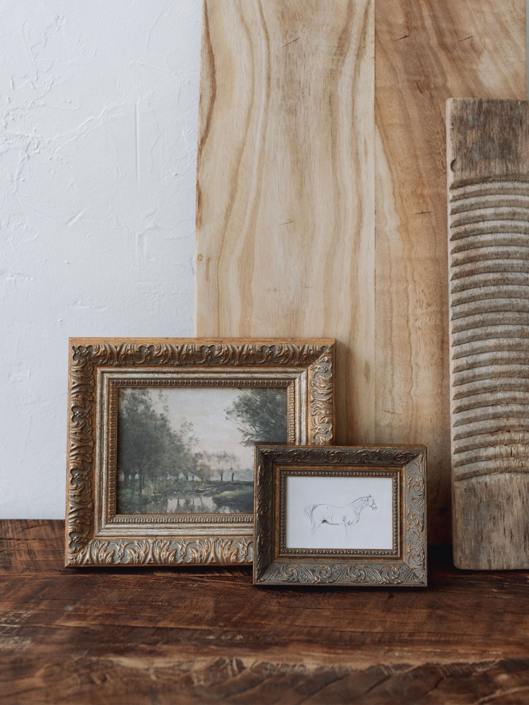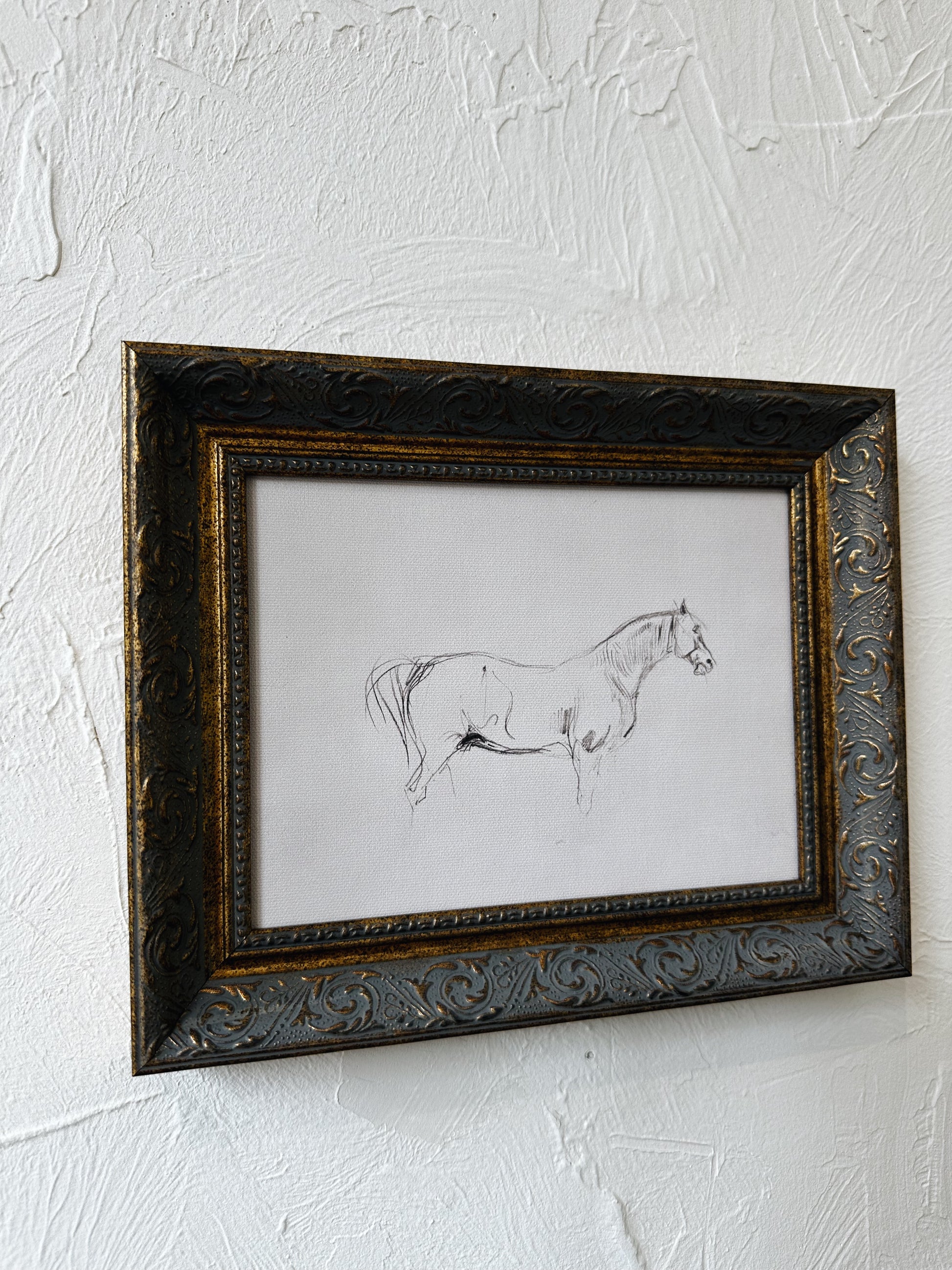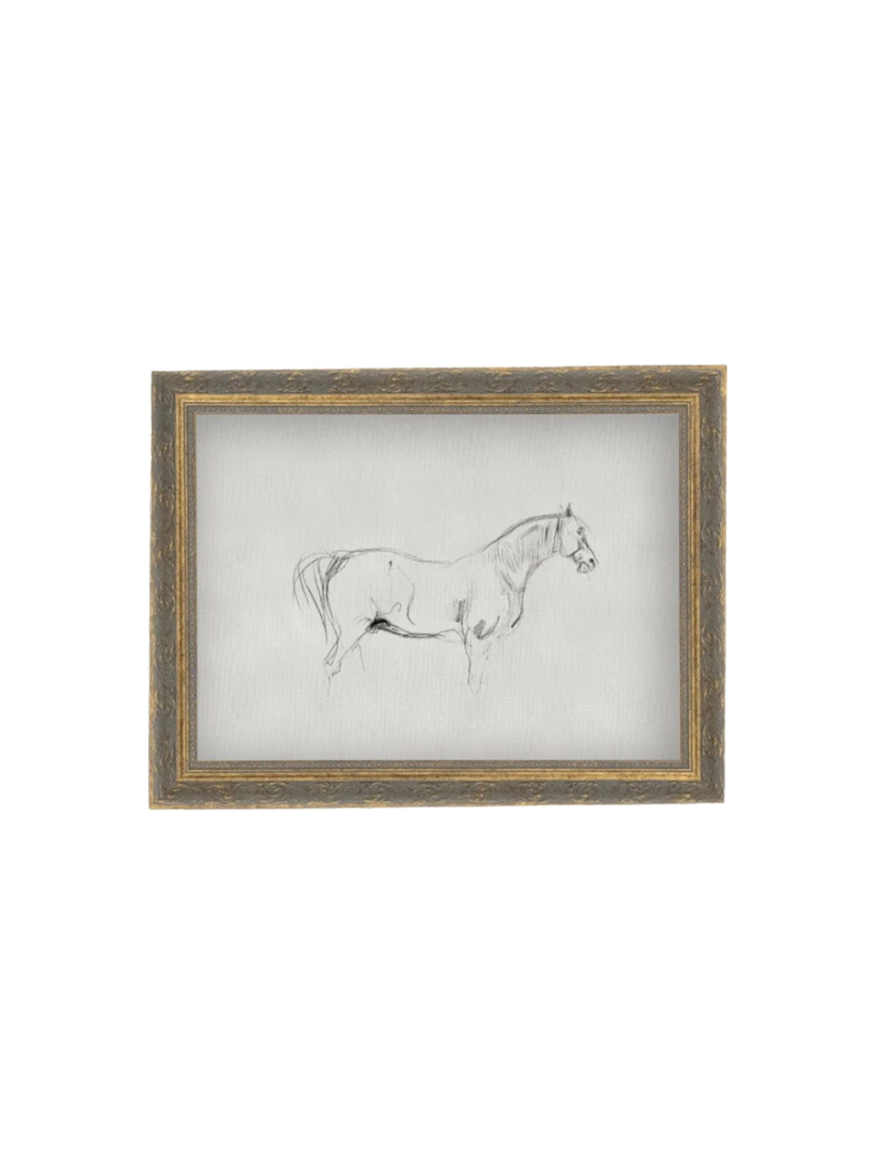 This vintage sketch of a horse is printed on raw canvas and placed in an antique frame for an authentic, timeless look.
