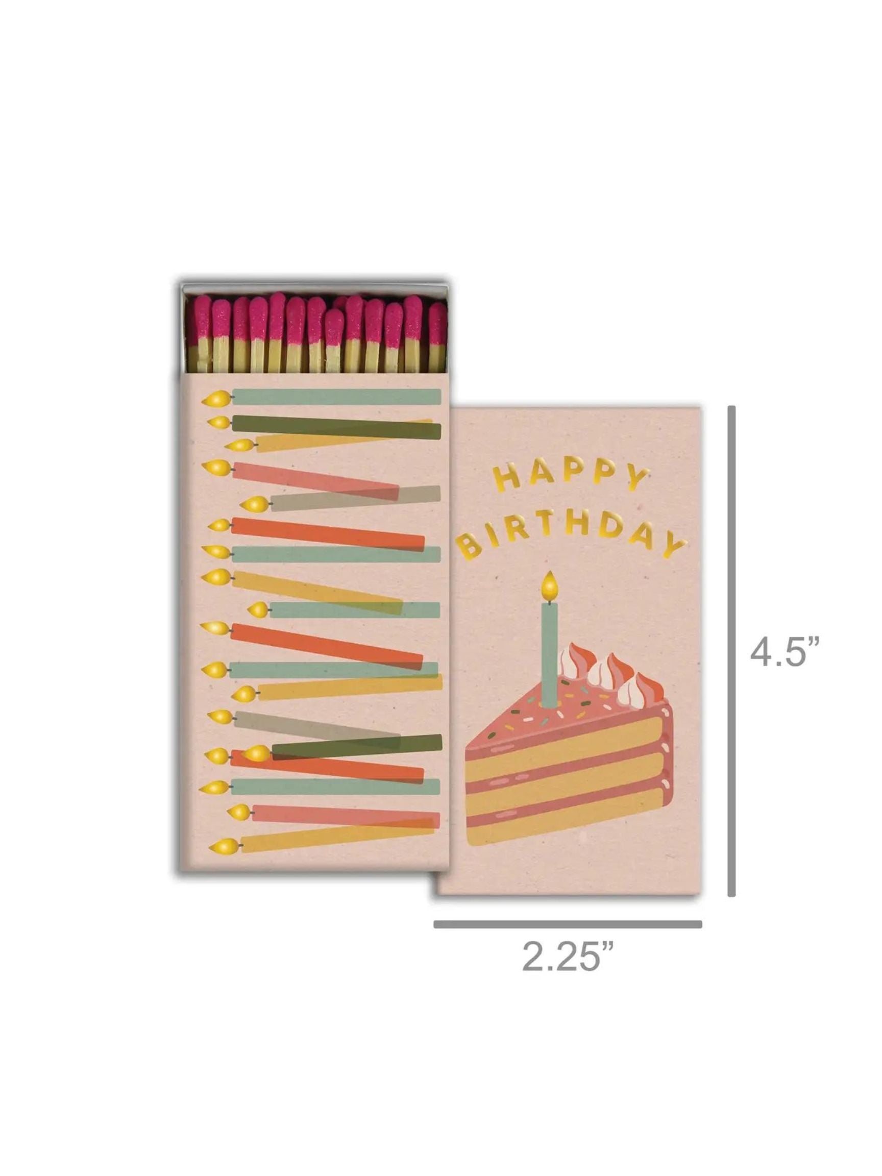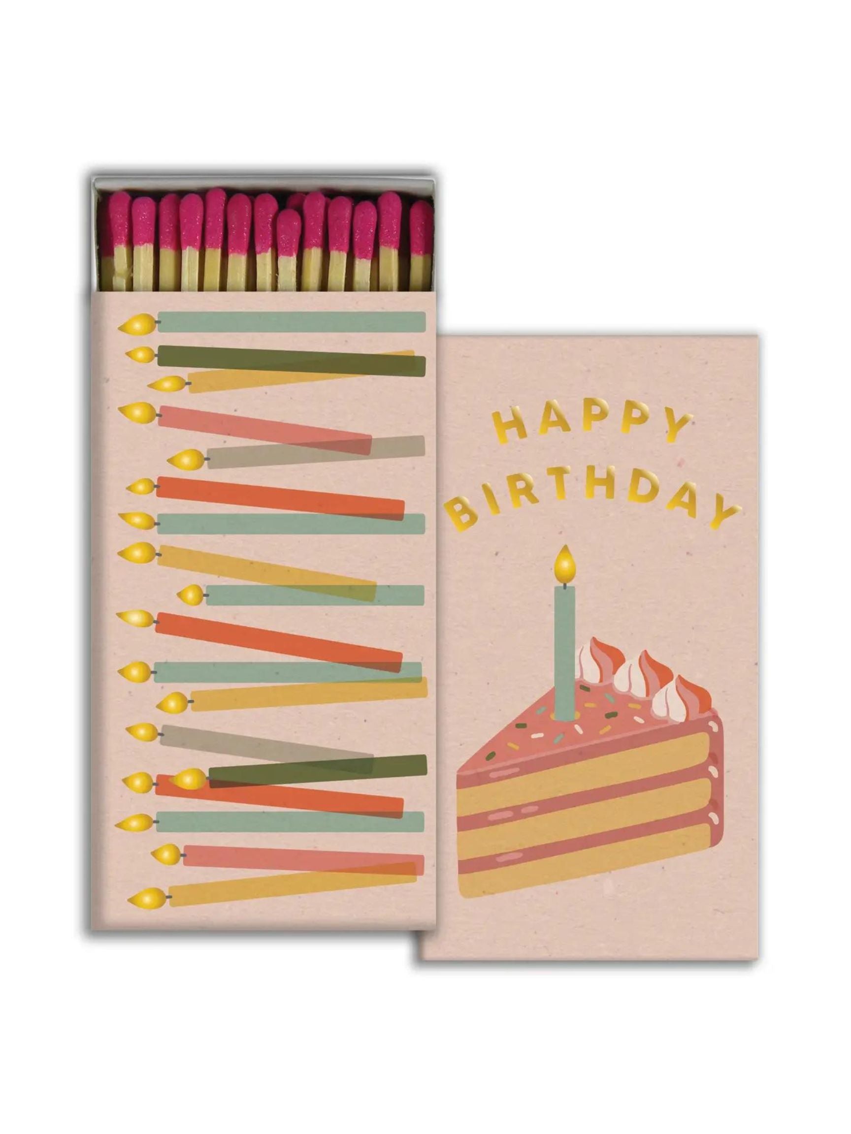 Cake and Candles light up our designer matchbox, to wish Happy Birthday! With layers of pink tipped matches peeking out of this celebratory box, pair with a candle and bottle of wine or slide under the ribbon of your gift and make it picture perfect. 50 sticks per box.
