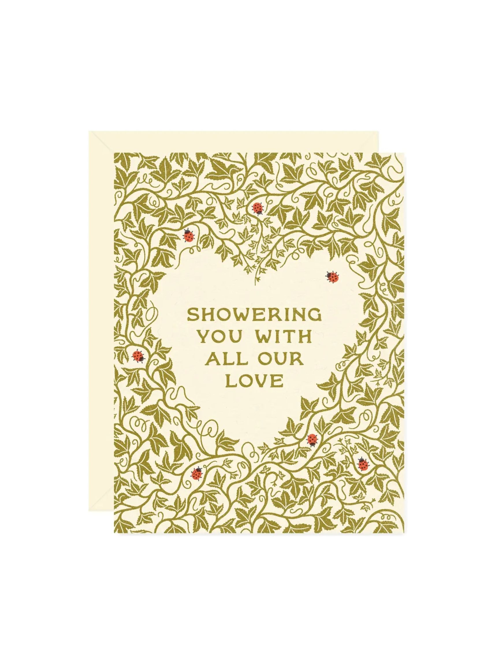 Shower with love: Perfect for any bridal, wedding, or baby shower, this card is covered in leafy vines and ladybugs grouping together to form a heart that surrounds your best wishes! Front text reads: "Showering you with all our love.”