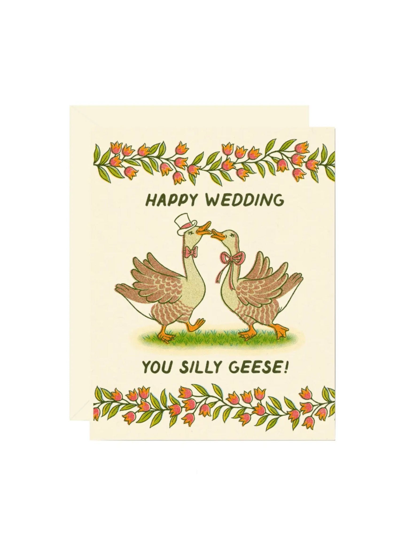 Two silly geese dressed in their finest bows and hats eagerly meet under a sweep of braided tulips to recite their nuptials. Front text reads: “Happy wedding you silly geese!”