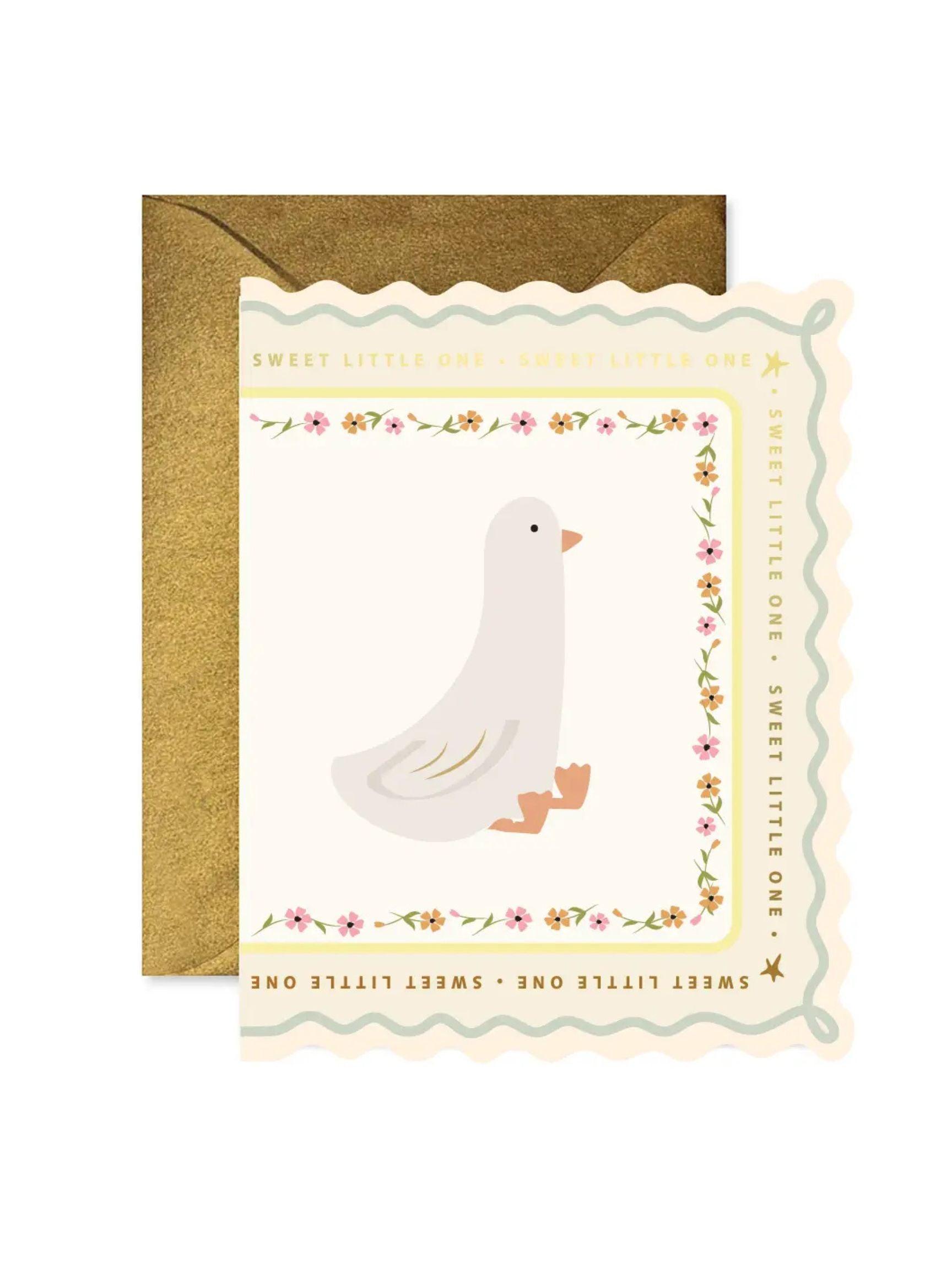 Stylish new "sweet little one" card die-cut into a sweet scallop shape. With gold foil. Full - color 4.25" x 5.5" folded greeting card. Blank interior. Our greeting cards come individually packaged in a plastic sleeve.