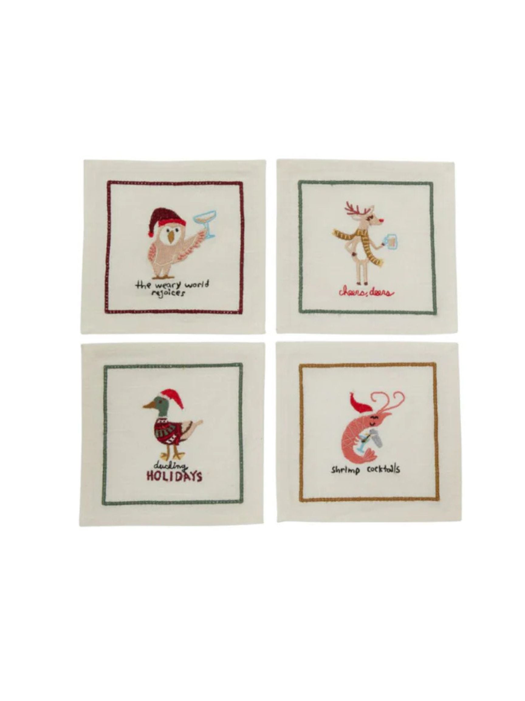 Celebrate the holidays with festive cheer and playful designs from the Tipsy Critter Cocktail Napkin Collection. Each slub cotton napkin features a unique critter in holiday attire, adding a touch of whimsy to your gatherings. Choose from a mallard duck with the punny phrase "ducking holidays," a pink shrimp with "shrimp cocktails," a red-nosed deer with "cheers, deers," or an owl with "the weary world rejoices." Each napkin is bordered with a coordinating chainstitch and pairs perfectly with cocktails, mocktails, and good company. Collect all four styles to complete your holiday tabletop.