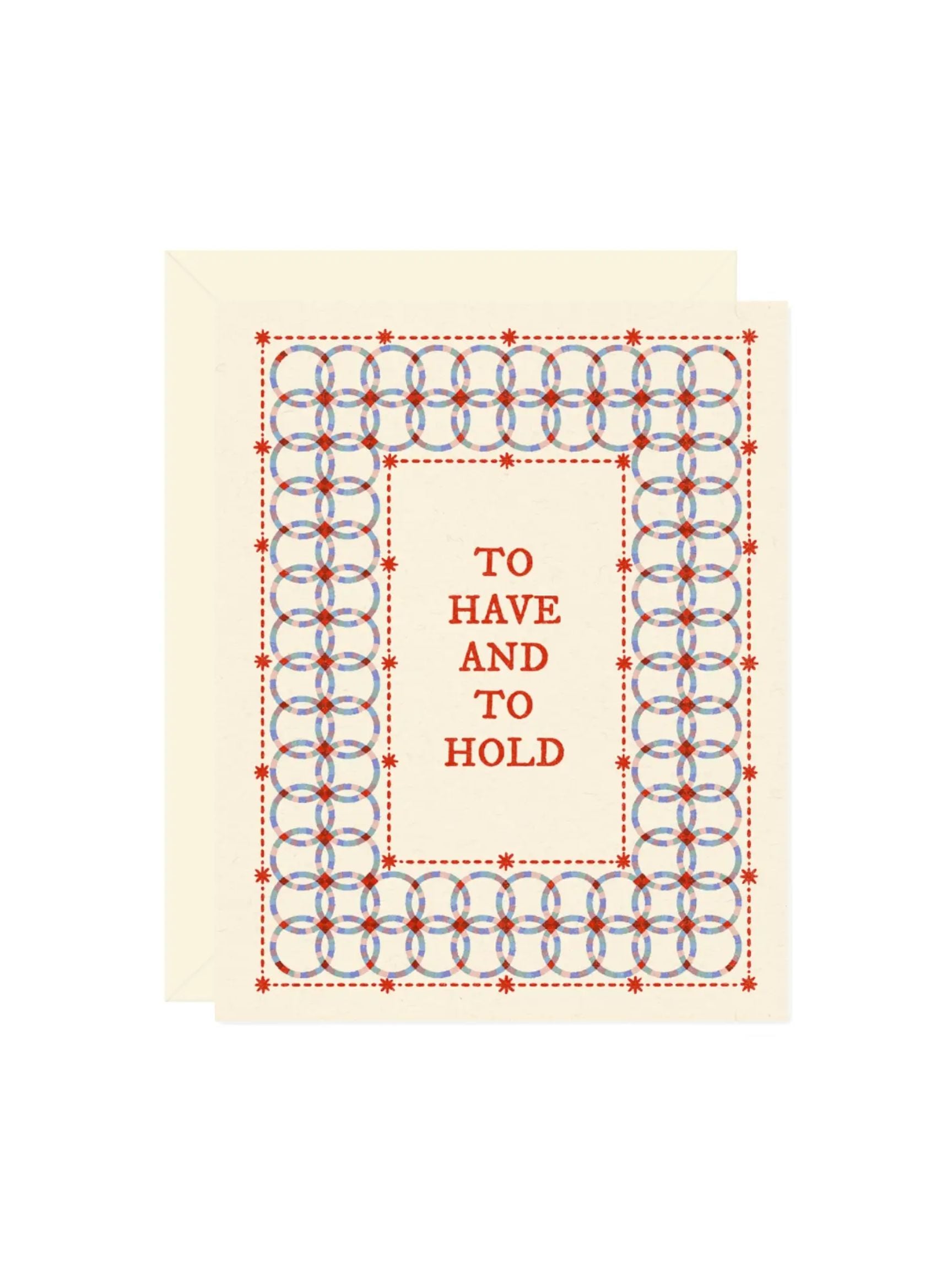 Based off tradition, our wedding quilt card features an interlocking ring pattern framing the text: “to have and to hold,” creating a romantic and timeless wedding sentiment.