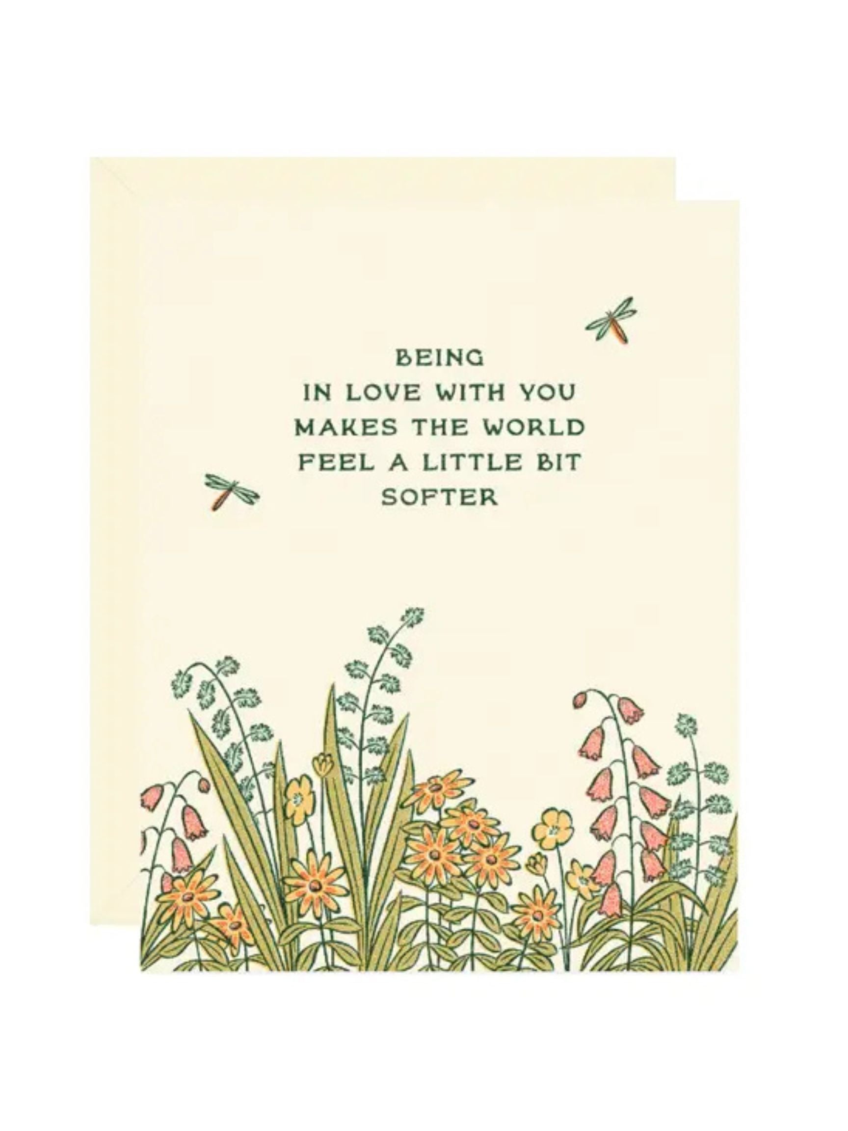 Love greeting card featuring wildflowers and dragonflies with the romantic message “Being in love with you makes the world feel a little bit softer.” Perfect for anniversaries, weddings, or Valentine’s Day.
