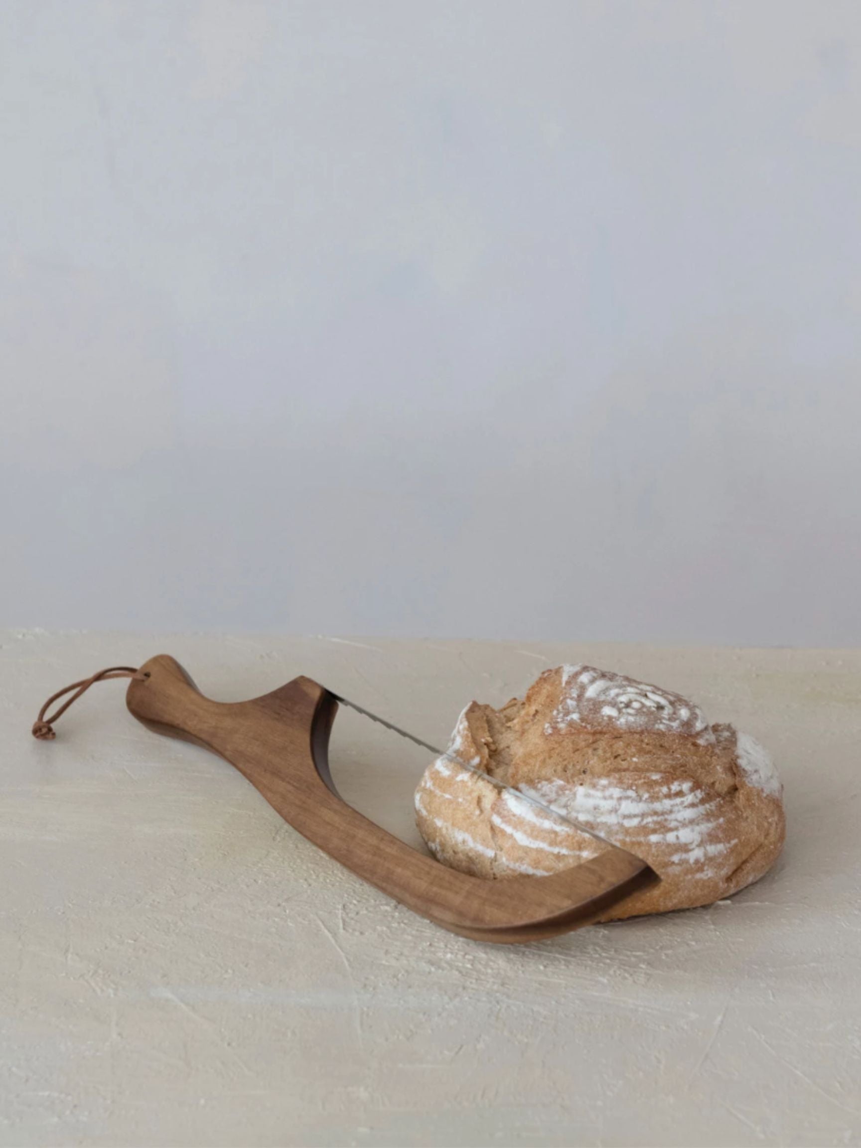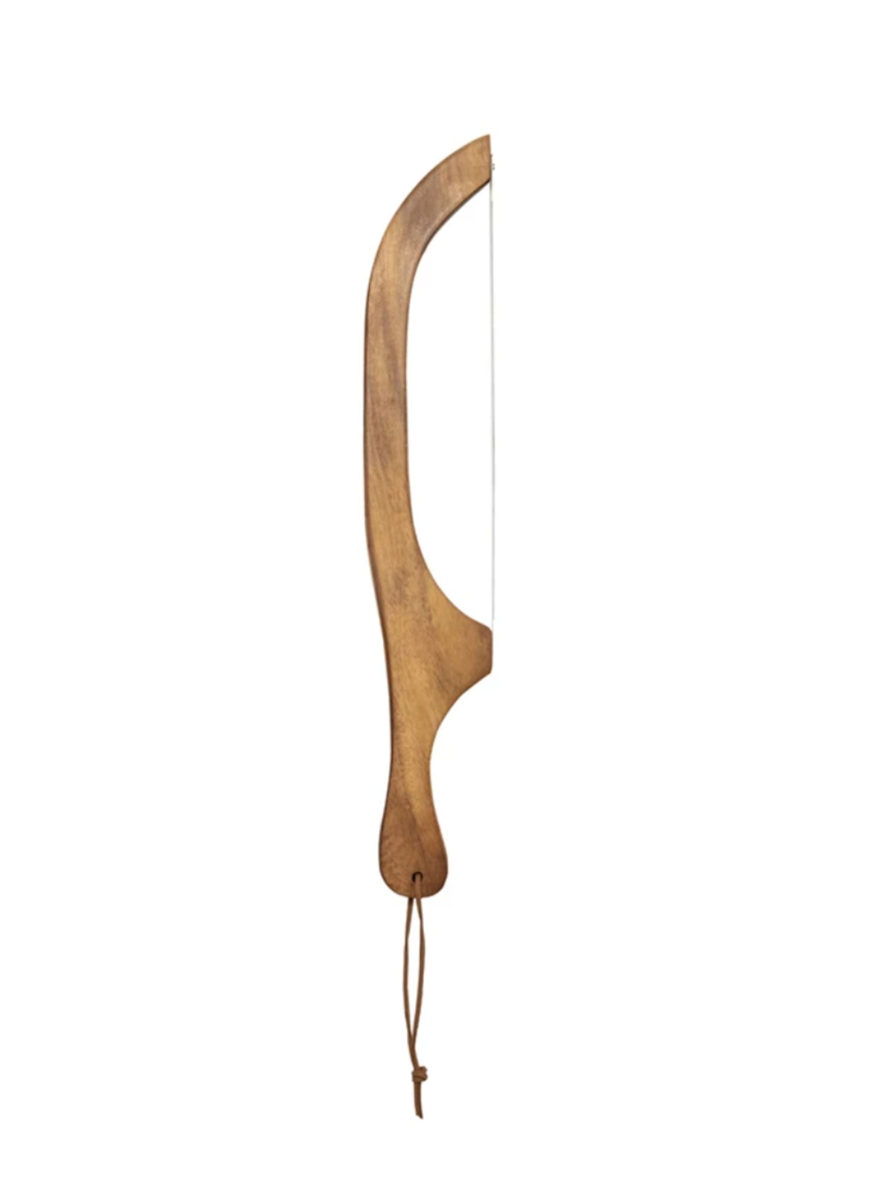 Wood Bread Bow Knife w/ Stainless Steel Blade & Faux Leather Tie